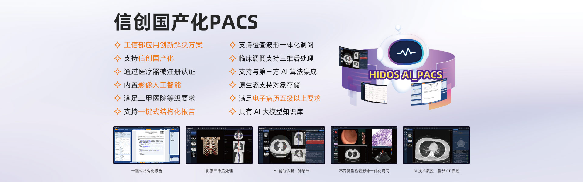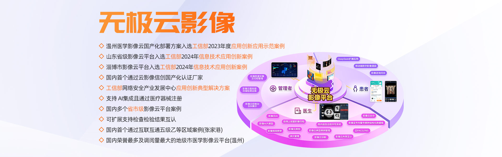 影像信息化深耕15年以上,影像產(chǎn)品群全面,擁有全院PACS/RIS、影像檢查醫(yī)技臨床預(yù)約、云影像(云膠片)、區(qū)域影像暨檢查互認(rèn)、影像中臺(tái)、影像人工智能、MDT多學(xué)科聯(lián)合會(huì)診、遠(yuǎn)程醫(yī)療協(xié)同平臺(tái)解決方案,是國(guó)內(nèi)極少能全面提供上述全套產(chǎn)品群的廠(chǎng)家之一。